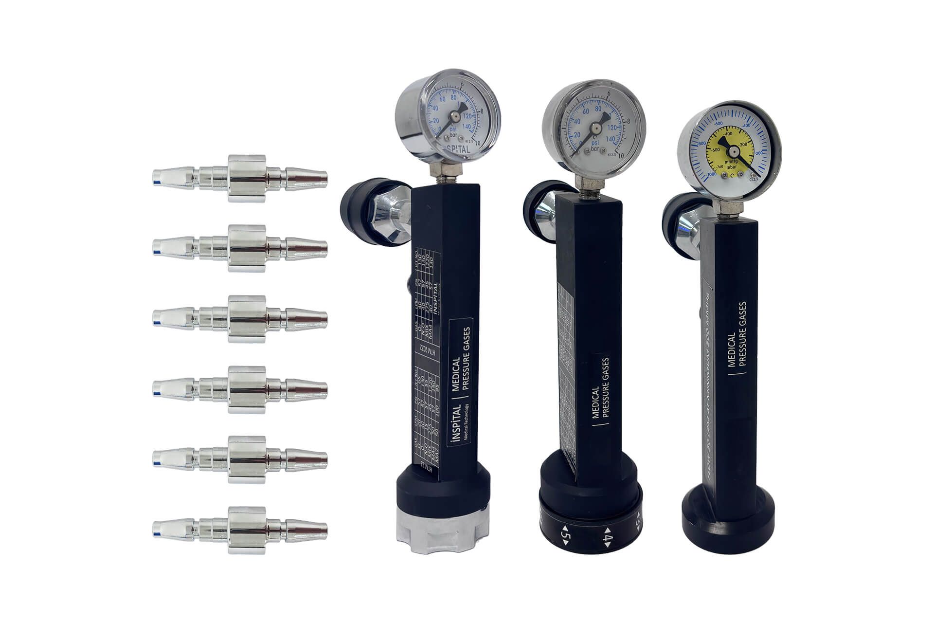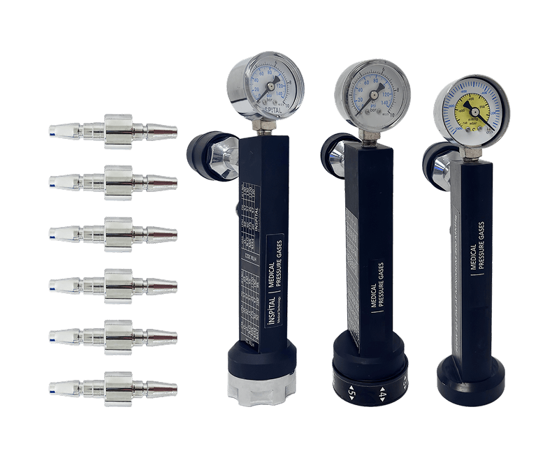 • Altı farklı tıbbi gaz türüne kadar test için iki adet özel basınç tabancası ile donatılmıştır.