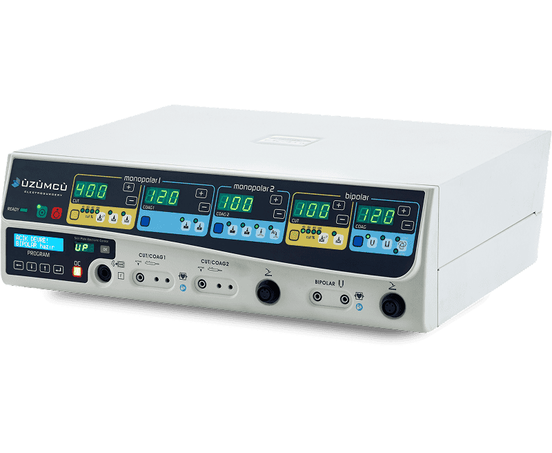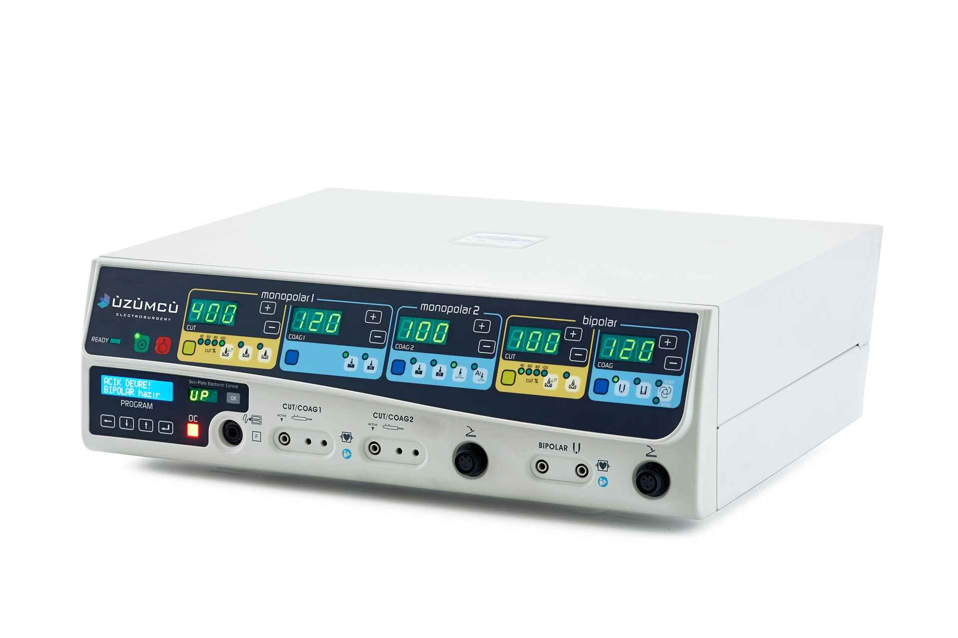 Üzümcü EK-410 model Elektrokoter Cihazı, 400 W maksimum çıkış gücüyle genel cerrahi, ortopedi, üroloji, kalp damar cerrahi ve nöroşirurji vb. tüm cerrahi branşlarda kullanılabilen, monopolar ve bipolar çalışma özelliklerine sahip bir elektro cerrahi  çözümüdür.