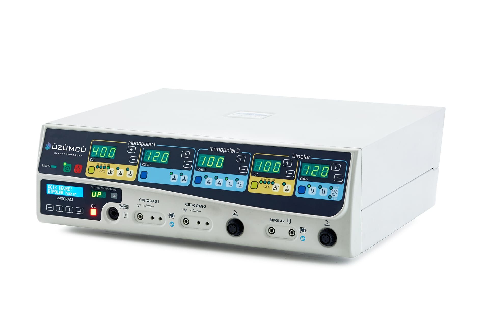 The Üzümcü EK-250 Electrosurgical Unit, with a maximum output power of 250 W, is an electrosurgical solution suitable for use in all surgical specialties, including general surgery, orthopedics, urology, cardiovascular surgery, and neurosurgery, featuring monopolar and bipolar operating modes.