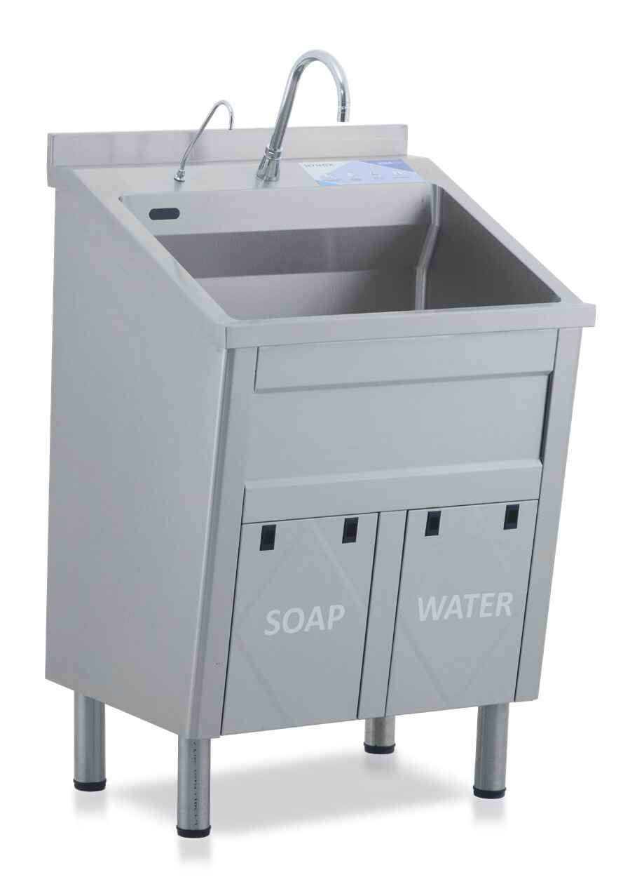Designed with the principle of touch-free use, the units can provide photoelectric or knee-controlled water flow and knee-controlled soap flow separately at each station. This structure allows hand hygiene to be maintained without interruption during the process and without creating a risk of contamination. The integrated thermostatic mixer ensures that the balance between hot and cold water is safely controlled.