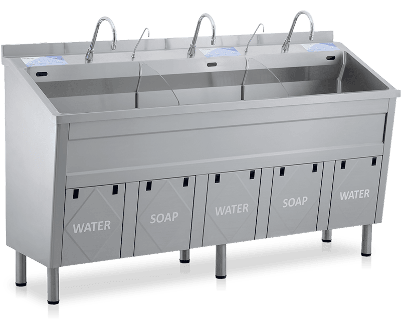 The 80800 model Surgical Scrub Sink Unit is designed for simultaneous use by three people.