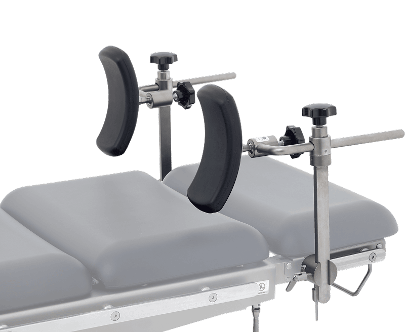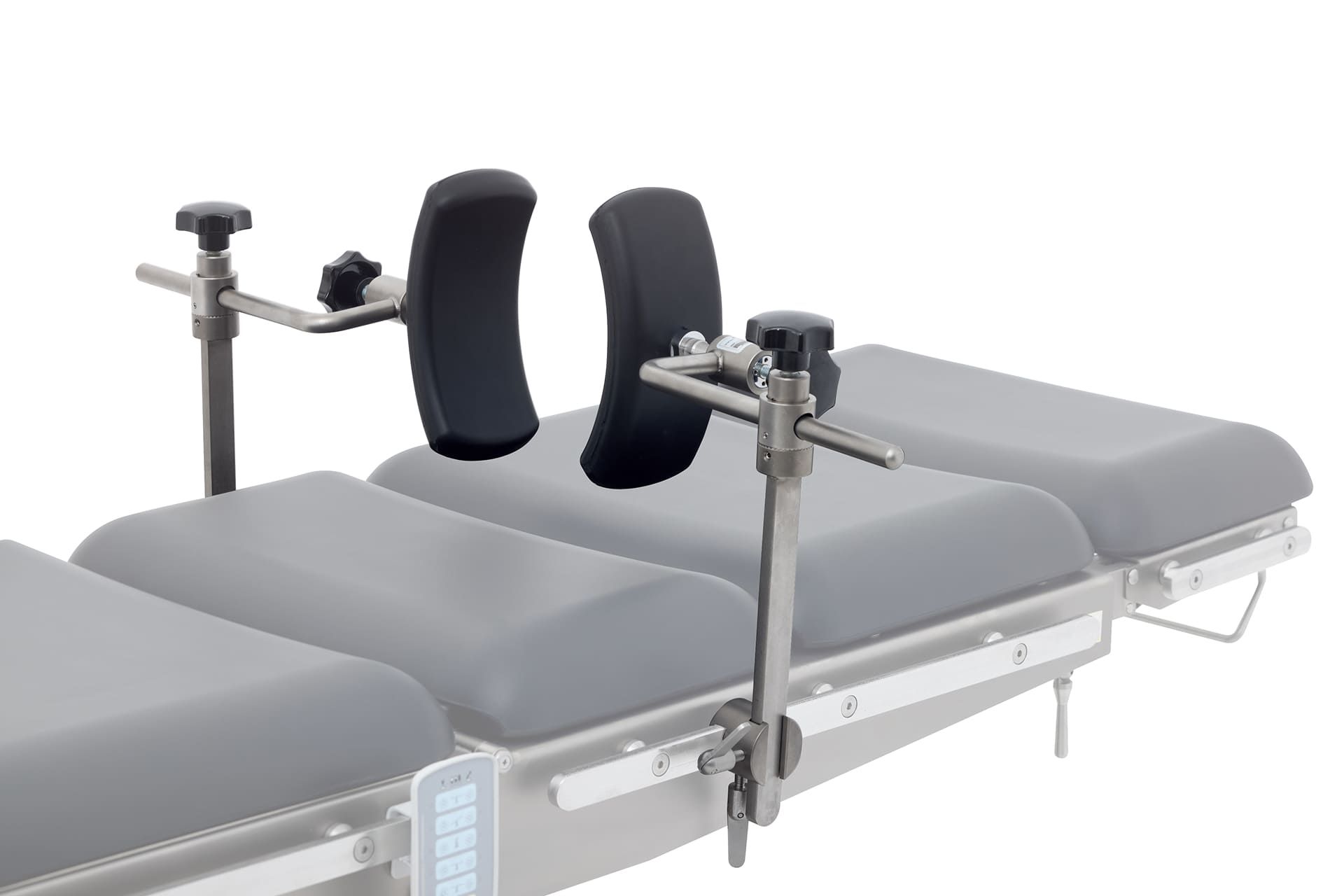 El mecanismo de articulación con rodamientos permite que el cojín de soporte sea tanto giratorio como ajustable en ángulo. Los cojines de poliuretano con forma anatómica aumentan el confort del paciente y minimizan los puntos de presión.
