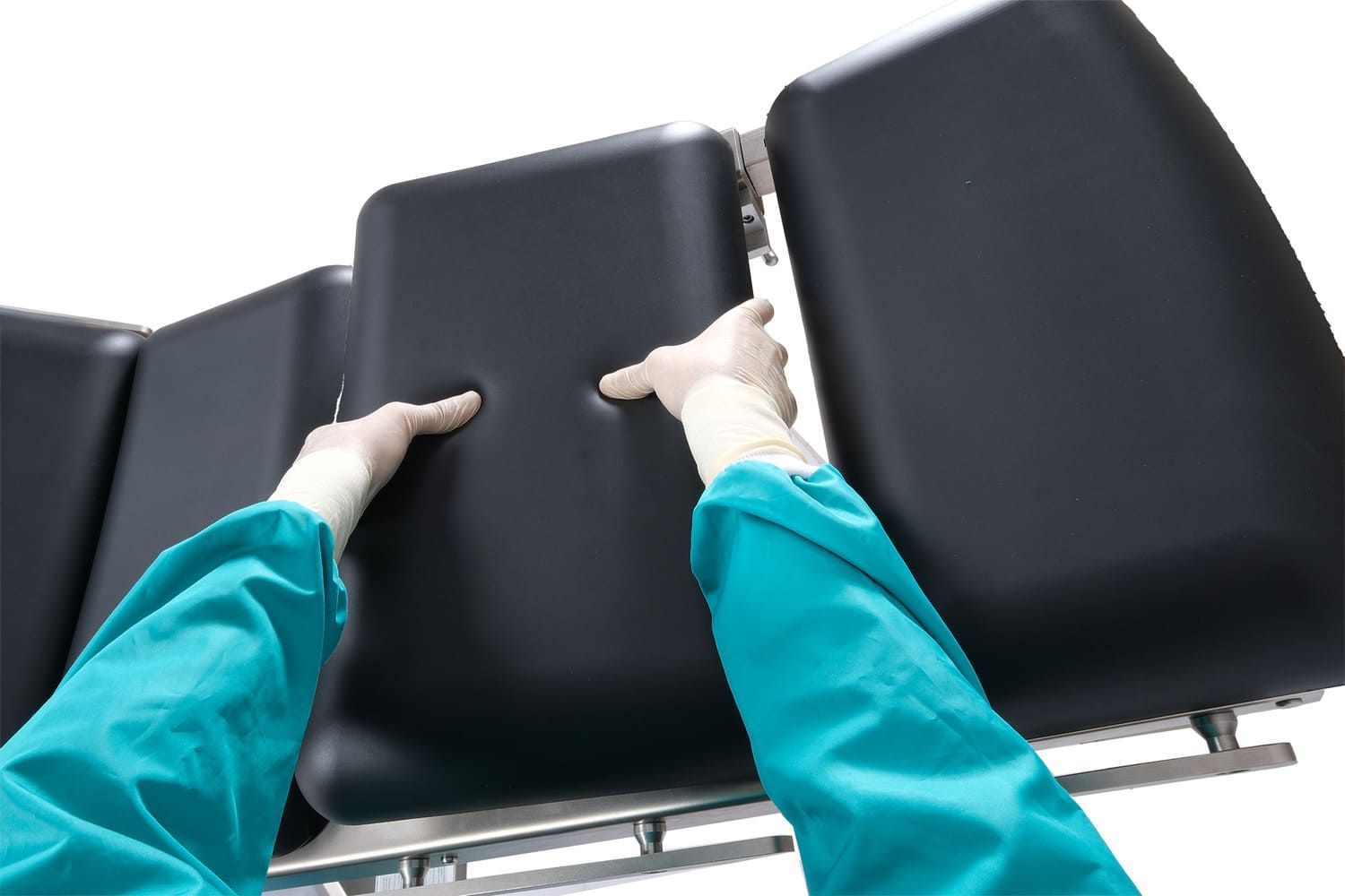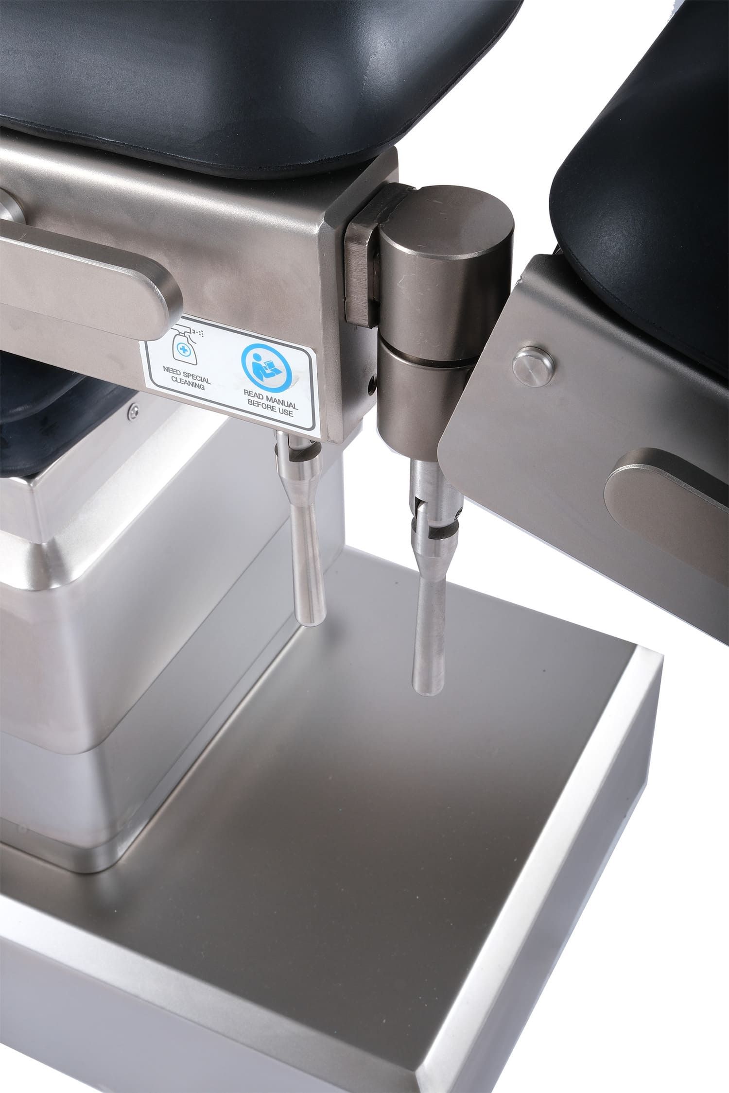 Diseño Modular El sistema ofrece flexibilidad gracias a su diseño, que permite posicionarlo en varios ángulos según el tipo de operación quirúrgica, y facilita su uso mediante las placas de cabeza y pies desmontables.La placa de pies desmontable permite un acceso ilimitado a la zona perineal, proporcionando máxima comodidad durante los procedimientos quirúrgicos.