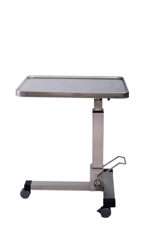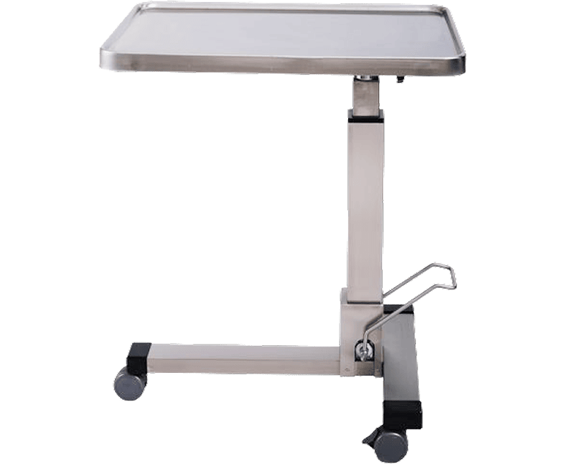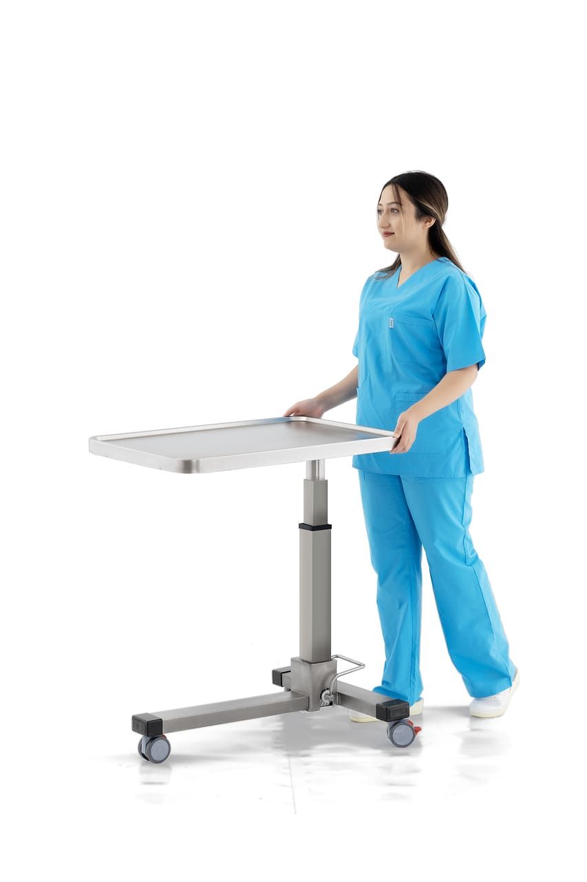 Три поворотных колеса, два из которых с тормозом, обеспечивают лёгкость перемещения и стабильность установки, делая стол практичным и надёжным вспомогательным оборудованием для операционных.