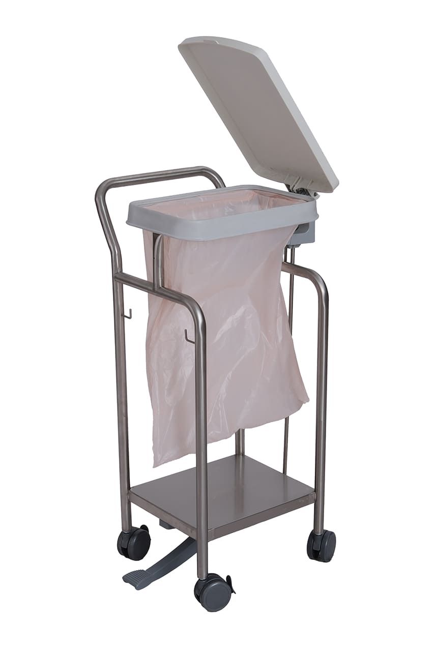 Механизм открывания крышки с ножной педалью обеспечивает бесконтактное использование, снижая риск инфекций и поддерживая стандарты гигиены. Специальные пластиковые зажимы надёжно фиксируют пакеты, а четыре колеса, два из которых с тормозом, обеспечивают лёгкость перемещения и безопасную фиксацию. Прочная нижняя полка надёжно выдерживает вес больших мусорных пакетов, обеспечивая долгосрочную эксплуатацию.